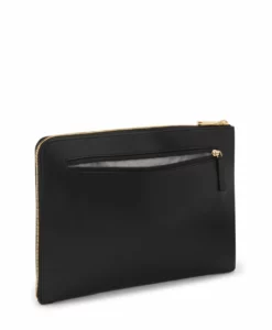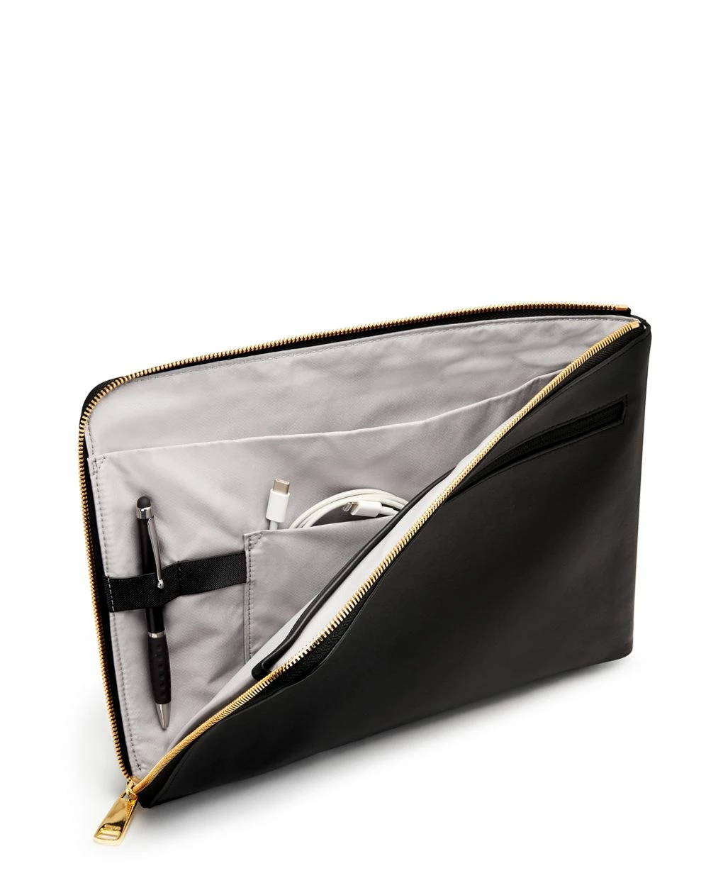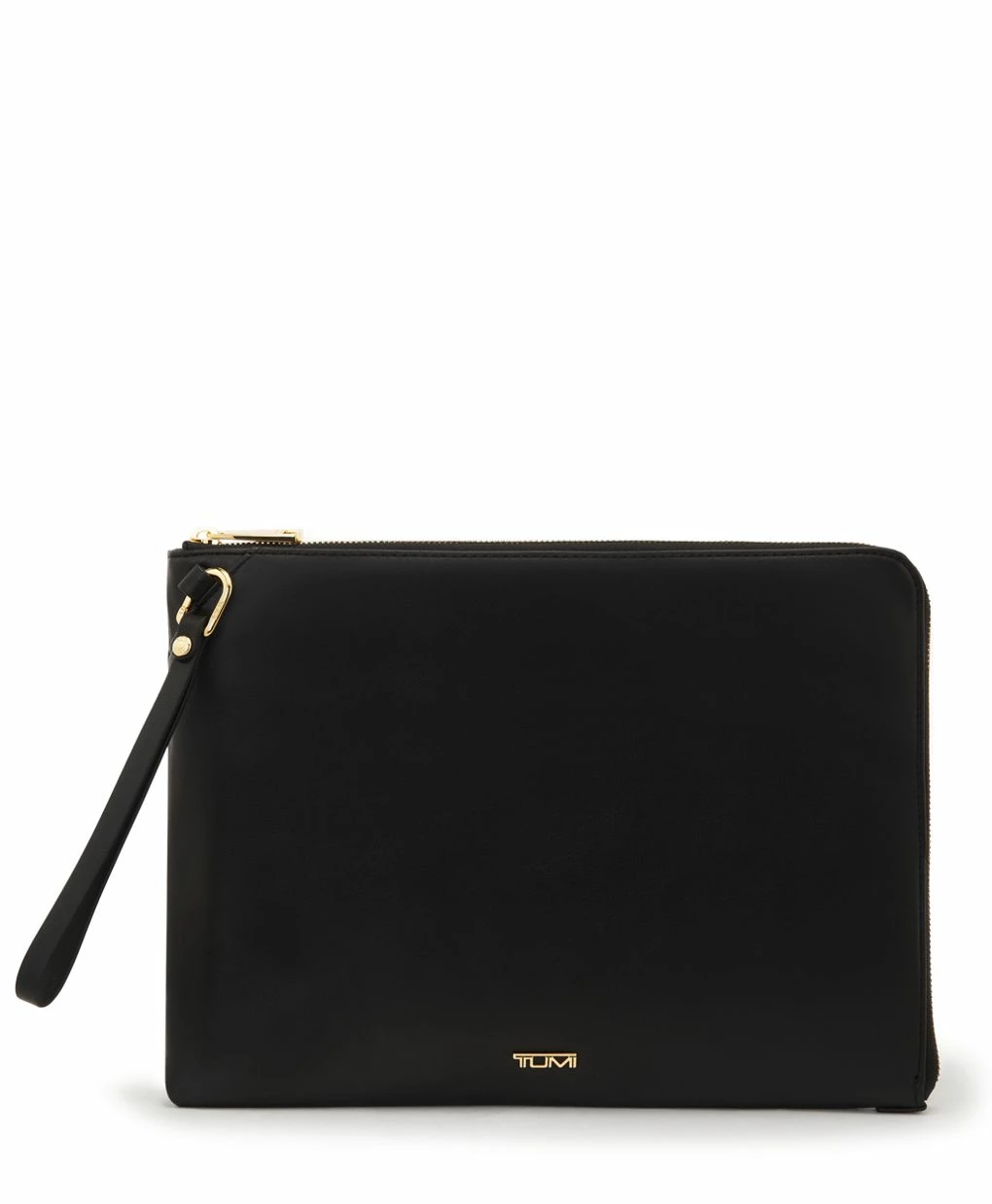 This sleek leather clutch holds all of your tech accessories in style. Multiple pockets keep essentials, even your cords, organized while a removable wristlet strap offers maximum versatility.